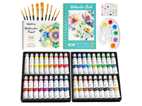 The Nicpro Watercolor Paint Set is designed to give artists everything they need in one comprehensive package. With 36 richly pigmented tubes, brushes, paper, and accessories, it’s a complete solution for beginners and professionals alike.